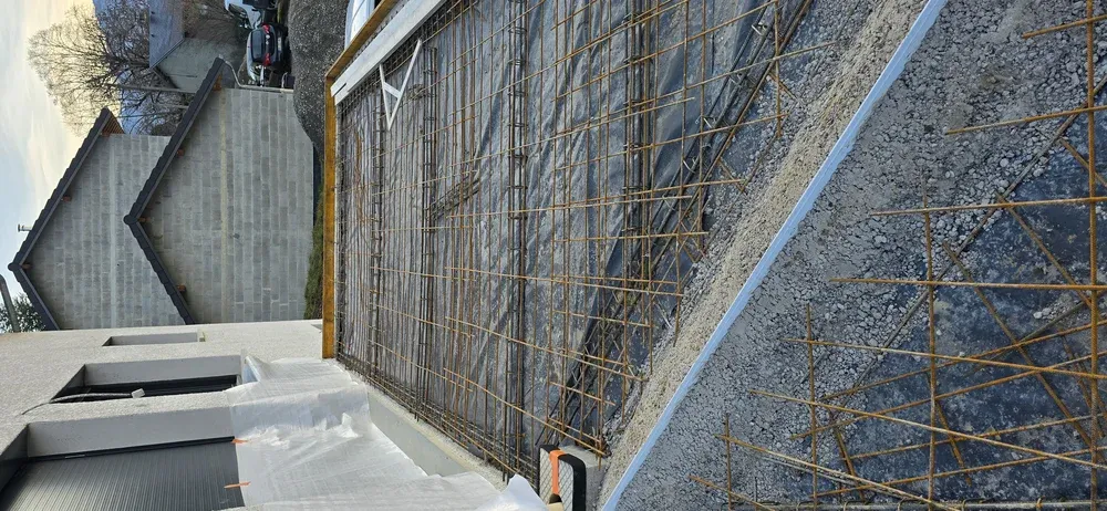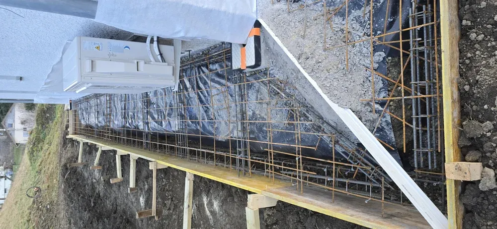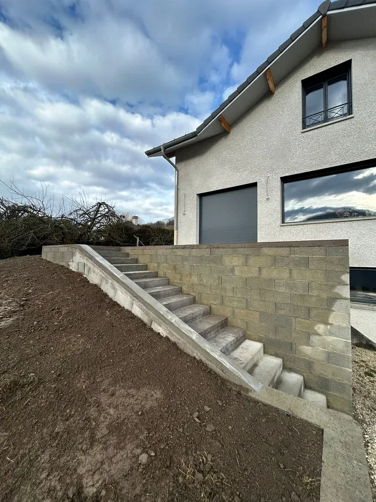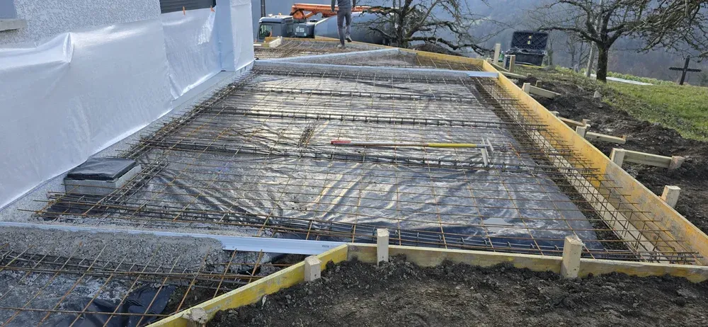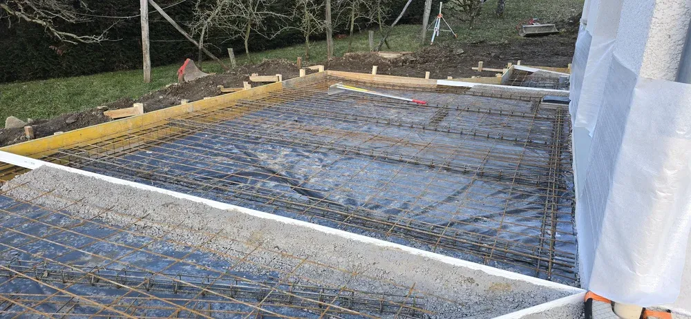 Pour ce projet, nous avons procédé à un terrassement minutieux, suivi de la mise en place d'un coffrage, du ferraillage et du coulage d'une dalle en béton d'une épaisseur de 13 cm. Ce travail de précision garantit la solidité et la durabilité de la structure.