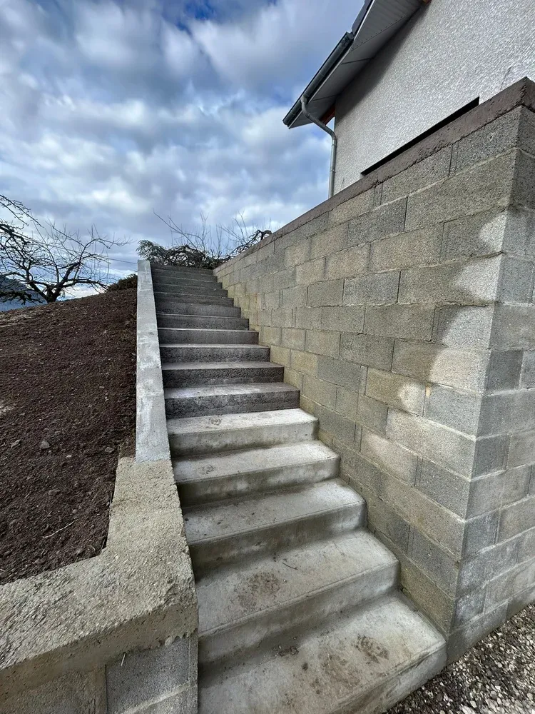 Nous avons utilisé des torches chimiques pour ancrer solidement la dalle à la façade, et réalisé une bêche périphérique de 30 cm de large par 50 cm de profondeur, assurant ainsi une stabilité optimale. La réalisation de joints de dilatation a également été une étape cruciale pour prévenir les fissures et garantir la pérennité de l'ouvrage.