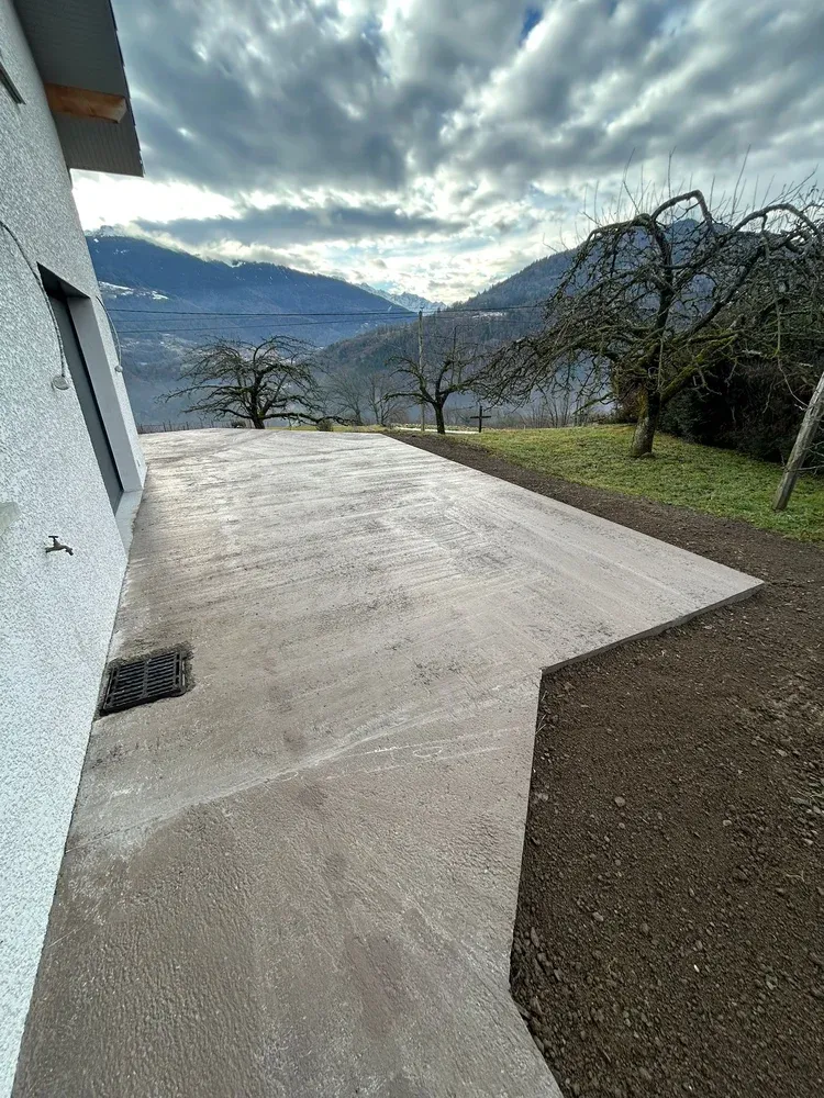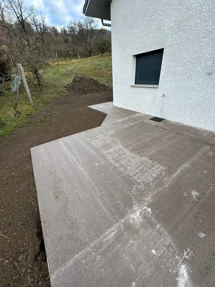 La dalle béton a été finie avec soin, tirée à la règle pour accueillir une terrasse en carrelage grès cérame de 20 mm d'épaisseur. Cette attention aux détails assure une surface plane et prête pour la pose du carrelage.